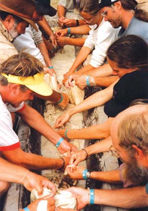 Class participants brain hides in a dug out canoe