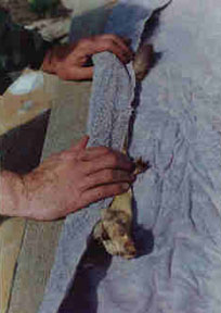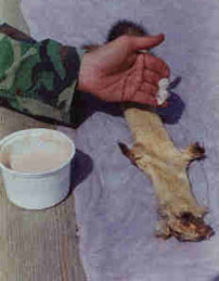 ![]() Place the fox skin on the towel and pour more of the brain mix onto the skin. You want to have the skin covered with it. Turn the skin over and do the same on the other side. Next roll the skin up in the towel and let it set for a couple of hours. Remember to put the bowl with the brain in it in the refrigerator until you need it again. |