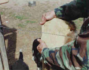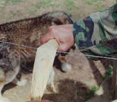 ![]() To soften the skin I use a new beaver snare, or you can use a piece of steel cable (available at hardware stores or through the Braintan.com Store). I attach one end of the snare to a door knob and the other end to a solid object. This way I can increase or decrease the tension on the cable by leaning on the door. I begin pulling the skin back and forth across the cable (fur side in). This action causes friction which causes heat and helps dry the skin. I pull the skin different directions to work the fibers, I also stretch it with my hands. |