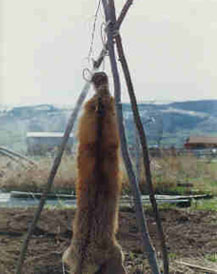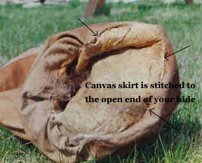![]() The easiest way to smoke the skin is to turn it fur side out and sew an 18 to 24 inch canvas skirt on it. This is sewed to the bottom of the skin so that it is slightly funnel shaped sloping up to the skin. One other thing: sew the leg holes closed as the smoke will discolor the fur anywhere it escapes. |