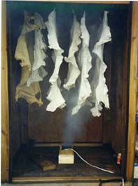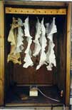 Two by twos are nailed across the outside and serve as handles to move the smokehouse over the firepit. Nails are placed on the top inside 2x4s and strings are run from nail to nail to hang the hides on. Hog rings are used to hang the hides from the strings. The current set up can accommodate 10 hides per run. Occasionally some hides tend to slip toward the center. I plan to replace the strings with rods as Mac suggested (see previous page) prior to the next smoke.