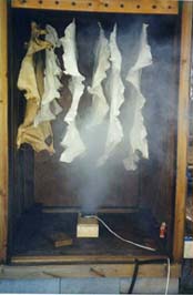 We get very evenly smoked hides. But the secret (now its out)…is a used $6 fan purchased from Northern Hydraulics (its mail order…available everywhere) to circulate the smoke. Adding that made a WORLD of difference! Because it keeps the air moving, the smoke doesn’t settle on the tops, folds etc. As far as deep browns, we get a nice golden (like you saw at the Rivercane Rendezvous) but we have been using oak sawdust/shavings. I think we will use green pine needles soon which give a nice dark color. It is risky using needles with a pit below the hides since they WILL flame up!
