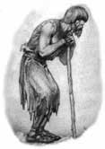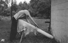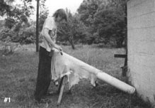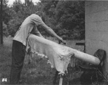 By raising both ends of the beam, the bending of the spine becomes nominal. In photo #3, the tanner starts out with his back straight and uses the muscles of the upper body to scrape the hide. Even after he has extended his arms, (photo #4) to the point that he has no control over the drawknife and can exert no pressure to clean the hide, the angle of his back is not much different than when he was in a full upright position.