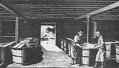 Highly developed bark ‘tanneries’ were common in ancient Greece, Rome and Egypt. The earliest known example of vegetable tanning comes from Gebelein Egypt, a tannery thought to be over 5000 years old. Bark tanned leathers were an important tool in the development of civilization, providing an immensely strong and durable material that was pliable; a very unique and useful combination. Bark tanning continued to be an important and basic trade throughout the world until the late 1800’s when cheap modern chemical chrome tanning methods came into widespread use for softer grain leathers, and rubbers and plastics started to replace denser leather for many uses. Unlike brain tanning, which wasn’t efficient to mechanize, bark tanning was mechanized from a very early date. The need for large quantities of bark to be crushed, and dozens of vats for the long soaks encouraged this.