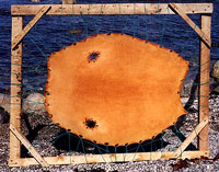 “They scraped it off (the alder bark) in very fine pieces and rubbed it directly on the skin to be dyed. The dryer the skin the quicker it took the dye. Some skins required two or three applications. Then the sides were folded against each other and the skin was left in a cool place overnight. Shaken free of bark in the morning, it was rubbed and pulled with the hands in all directions. Worked, allowed to dry, worked etc., until it was dry and soft. Oil might be applied if the skin were too hard.”