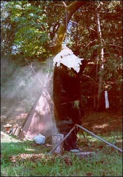 For this purpose, Natives would pull the skin around an upright pole; or fix to a tree a twisted cord of rawhide, or a buffalo shoulder blade bone with a hole in the center. Besides the pulling, I stretch the hide over my knees and shake it out every once in a while to help it regain its original shape. Then I put it up to dry some more. After a while, I repeat the pulling and stretching process. While it is hanging to dry, I stretch it with my hands in all directions a little.