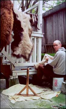 My first encounter with live buffalo was a rather unimpressive one. In my early twenties, I traveled to New York and went to visit a friend in Buffalo, NY. After arriving at the train station at night, he drove me to the local zoo to see the namesakes of his town. There they were, in a small enclosure, sadly staring from the dark into the headlights of our truck. Today I live in San Francisco and am fortunate to have a small herd of bison close by. They live in Golden Gate Park in the middle of the city. I got my first real piece of buffalo from those animals in the form of shed winter hair that I collected when I was volunteering to help clean up the paddock. Then one day I ran across the address of Jim Miller of Michigan, the first man I heard of who was brain-tanning buffalo hides and teaching classes too. When I called him, he said I need not apply for class until I had tanned at least a half dozen deerskins and a bunch of pelts. Therefore, a few years later after I had accomplished that, I traveled to Michigan in January and was fortunate enough to have a one on one class with him. (call Jim at “Willow Winds” 515 736 3487 for information on his classes or a copy of his booklet “Brain tanned Buffalo Robes, Skins and Pelts”).