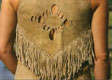 Short sundress is made of three hides, with long fringed bodice and skirt. Bodice front and back have decorative cut-outs that allow for ‘stylish’ ventilation. The herring-bone stitch accents the V-cut of the bodice.