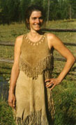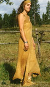 Long sundress is made of three hides with a contrasting yoke. Simple stitching is used throughout the garment with short fringe at the bottom, allowing for a graceful drape.