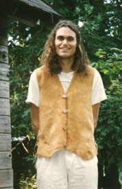 This is a two hide vest. It is not fitted, but styled with the intention of being able to wear it in the heat of the summer or the chill of the winter. For this reason the buttons, which are made of antler, close by buckskin loops instead of button-holes. This allows the vest to be adjusted when worn with a bulky sweater or fit more closely when worn with a shirt. The collar edging is done with a whip stitch that both stabilizes the shape and decorates. The bottom edge of this vest was left with the shape of the deer hide’s natural contours. The back of this vest isn’t shown but it has a ‘V’ shaped yoke with long fringe.