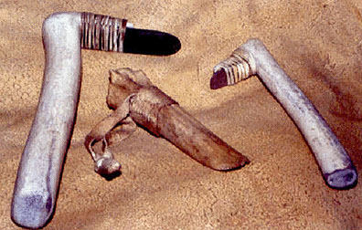 These ones are made, used and sold by Chris Hanson Left to right...elk antler scraper with steel blade, buffalo legbone flesher with sinew sewn braintan leather lanyard and small elk antler scraper with flint blade.