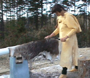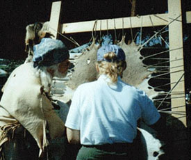 Jack Thompson dehairing a goat hide.