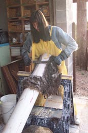 Erin is removing the hair and grain from her hide with a draw-knife over a pvc beam. I'm not sure if she has the beam anchored to the saw-horse, but it would really help keep the beam stable...and make the work easier.