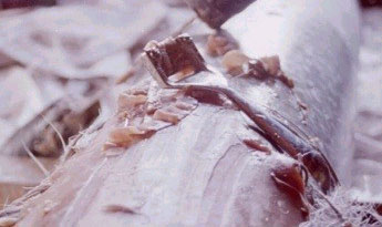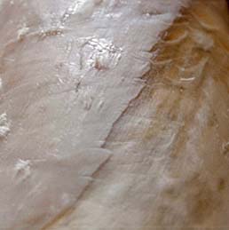 Here's a great close-up (from Bob Kurasawe) of the swollen grain one gets when soaking hides in alkali (wood ashes, Red Devil lye, or hydrated lime). The section on the left has the grain intact, on the right it is removed. If you use good technique and are careful to scrape each area thoroughly before moving on, you get a good crisp transition line like this. It makes it very obvious what still needs scraping, and it makes it easier to do.