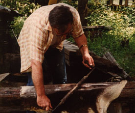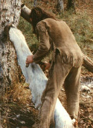The beam is leaned against a tree and the hide is pinned between the tree and beam. You scrape by pulling the tool toward you. Sheom's buckskins have been dyed with Black Walnut hulls to give them that deep brown color. He wouldn't need to stoop so much if he leaned the beam higher on the tree.