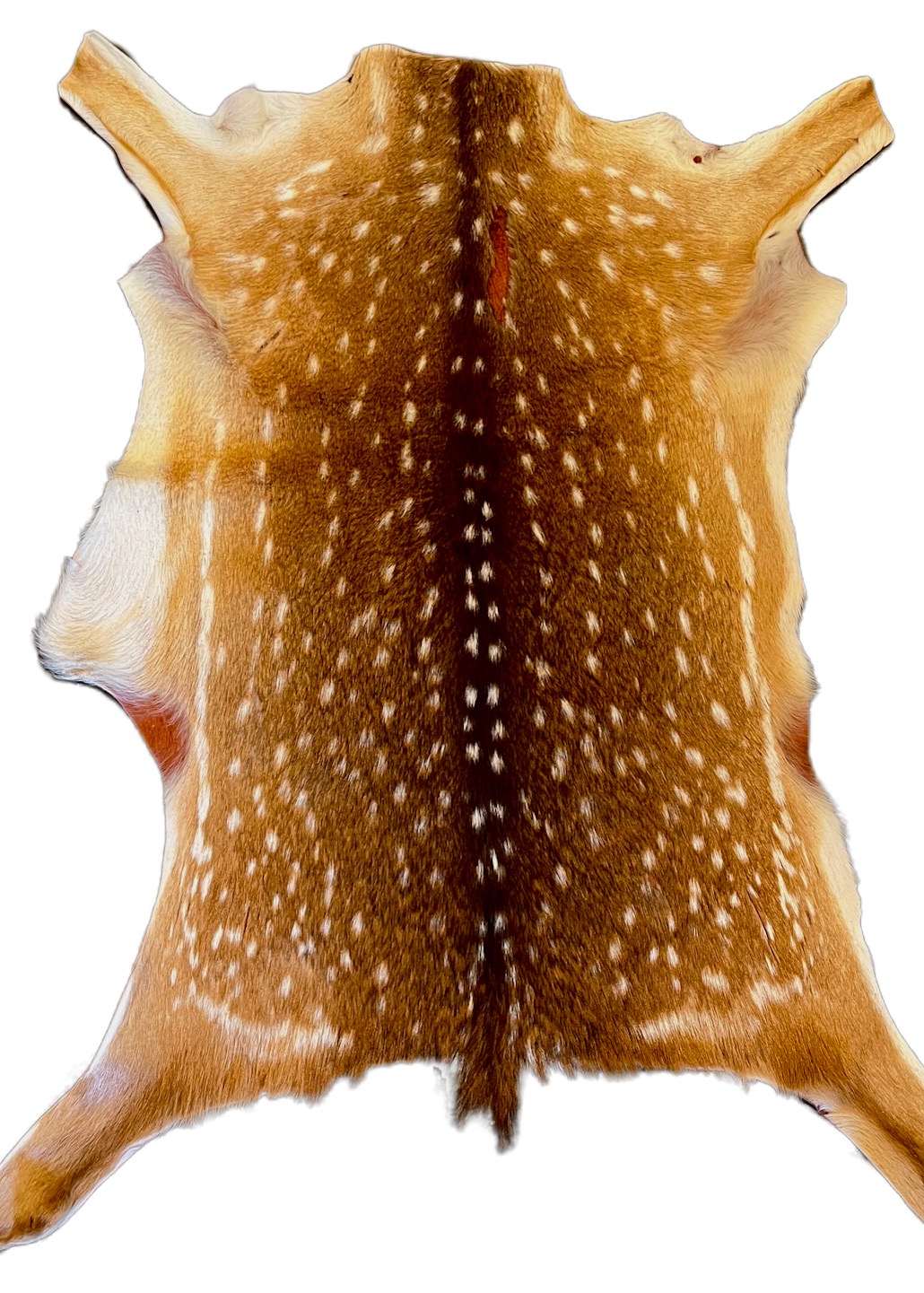 Gorgeous naturally tanned axis deer hide. Tanned with oak bark, mimosa tannin, woodsmoke, egg yolks, olive oil and nothing else.
