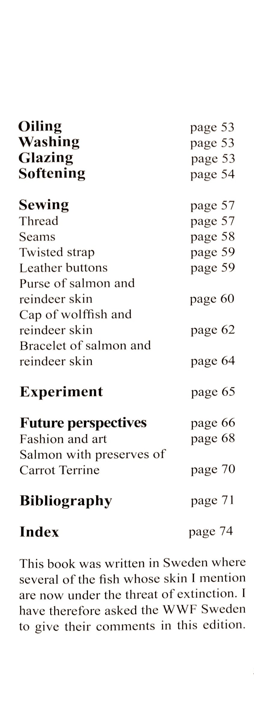 This is a well-researched, thorough, and informative book about making your own leather from fish skin. It includes traditional, organic methods and is the go-to book for anyone interested in tanning fish. The back cover summarizes it best: “The use of fish skin is an ancient tradition in societies found along rivers, streams and coasts all over the world. In areas where there were few other species, fish skin was regarded as a useful material. Today the interest in making use of fish skin, an undeveloped by-product, is on the rise and clothing as well as other products is made out of the skins. In order to use the skins they need to be tanned first, i.e. be prepared in a way that they keep the strength, smoothness, and flexibility present in their raw condition. This book contains recipes on how you can tan your fish skin with ingredients from everyday life such as olive oil, rapeseed oil, soap and bark. The book does also include sewing instructions and patterns. The author, Lotta Rahme, has a tannery and a studio in the medieval town of Sigtuna in Sweden. For over 30 years she has been studying and working with the art of tanning. She has lectured and led many courses throughout the Nordic region. Much of her knowledge has been acquired directly from Inuit, Native American, Sami and Ainu women”.