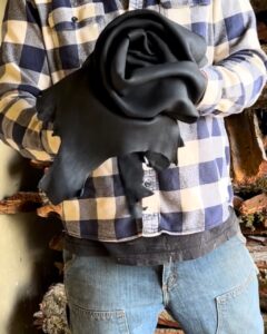 Deerskins naturally tanned with oak bark and then dyed to the deepest black, naturally. Split to an even thickness of 3 1/2 ounces, with an egg white glazed finish for easy cleaning, water resistance and shine.